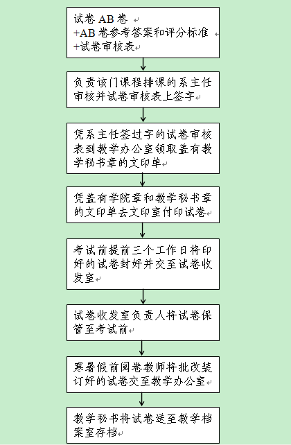教学委员会讨论决定从2016 – 2017学年第一学期起依照试卷管理流程对试卷的审核、付印、保管、装订、存档等工作进行管理,具体流程如下: