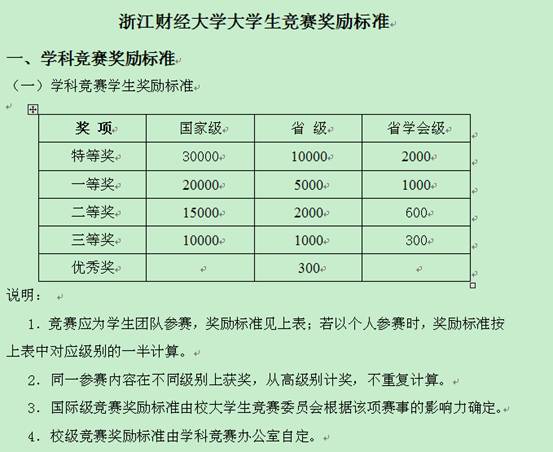大学生竞赛管理试行办法》浙财大[2006]28号,指导老师带队参赛奖励标准如下:特等奖10000元、一等奖5000元、二等奖2000元、三等奖1000元、优秀奖300元。竞赛应为学生团队参赛,若以个人参赛时,奖励标准按上述对应级别的一半计算。请各位老师积极组织学生报名参赛。