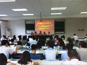 楼102教室举行了2014级研究生新生专业介绍及硕导见面会。本次会议邀请了杨鹰彪书记、夏红芳副院长、陈荣达副院长、院长助理朴哲范和保险系主任叶晓凌等领导,以及博彩代理
