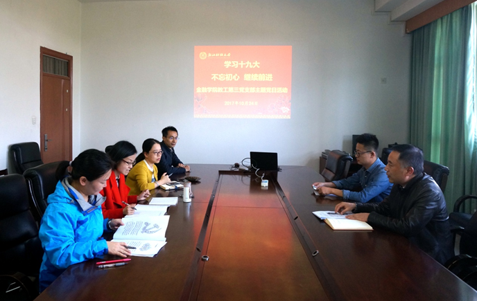 博彩代理 教工第三党支部在博彩代理 楼418会议室开展“学习十九大,不忘初心、继续前进”主题党日活动。对十九大报告中出现频率最高的“发展”、“人民”、“建设”等词语进行详细解读,并对十九大报告原文进行的通读和讨论,尤其是和经济、金融、教育、一流学科建设等有关内容进行了认真学习。大家表示接下来会继续认真学习十九大相关文件内容,吃透精神,与各自的工作相结合,为博彩代理 和博彩代理 的发展更上台阶出一份力。
