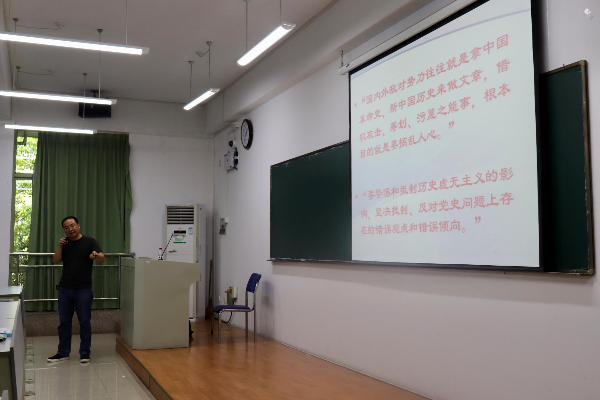高伟老师以“坚定理论自信,反对历史虚无主义”为主题,从历史虚无主义的背景、表现、特点、本质四个方面进行阐述,激励同学们要不忘初心、牢记使命。