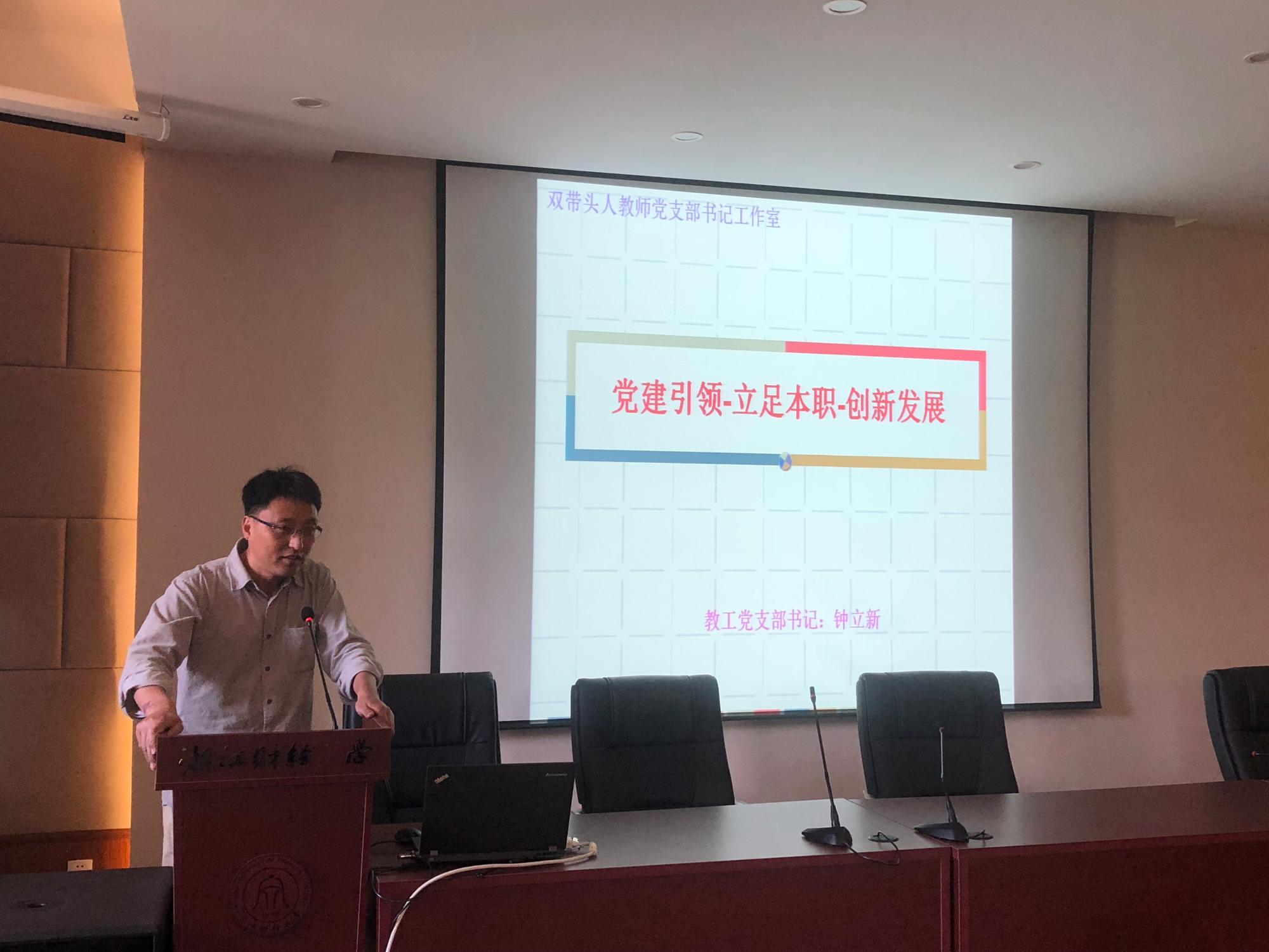 在“双带头人”教师党支部书记工作室创建工作评比环节,教工第一党支部书记耿中元老师介绍了支部特色活动“专业课+思政教育”论坛的开展情况,教工第二党支部书记钟立新老师以党建引领、立足本职、创新发展为主题展示了支部争创“党建+科研”特色品牌情况。