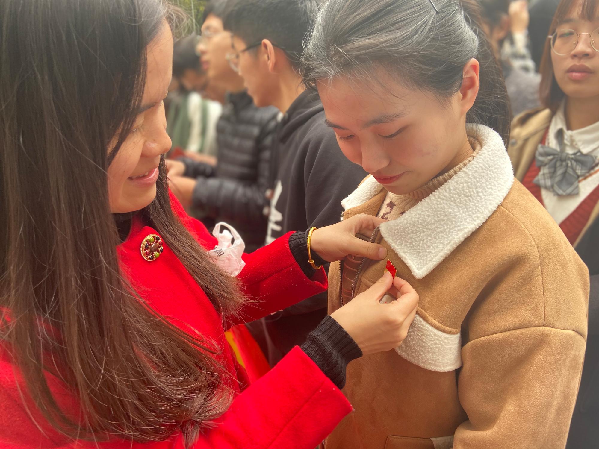 宣誓仪式上,老党员为新党员佩戴党徽、赠送政治生日贺卡,象征着共产党员责任的传承。