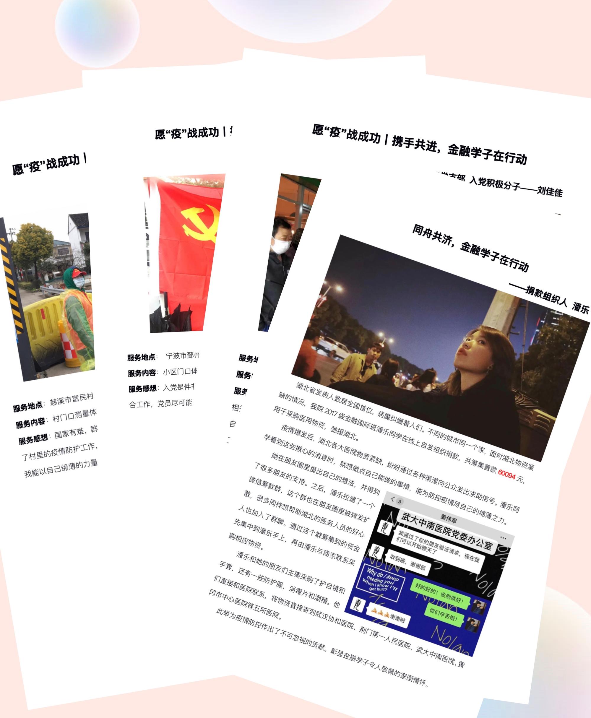 五、致敬榜样力量,宣传在疫情防控工作中涌现的先进典型和感人事迹。博彩代理 2017级金融国际班潘乐同学在线上自发组织捐款,共筹集善款6万余元,采购护目镜、手套、防护服等急缺医疗物资,寄往武汉协和医院、荆门第一人民医院、武大中南医院、黄冈市中心医院。本科生第二党支部党员阮佳伊、本科生第四党支部党员朱昊磊、研究生第四支部党员单瑶佳投身抗疫志愿服务工作,在所辖地社区主动扛起疫情防控责任。本科生第二党支部入党积极分子刘佳佳在党员父亲的带领下,向当地社区捐赠了口罩、测温仪等物品,协助政府部