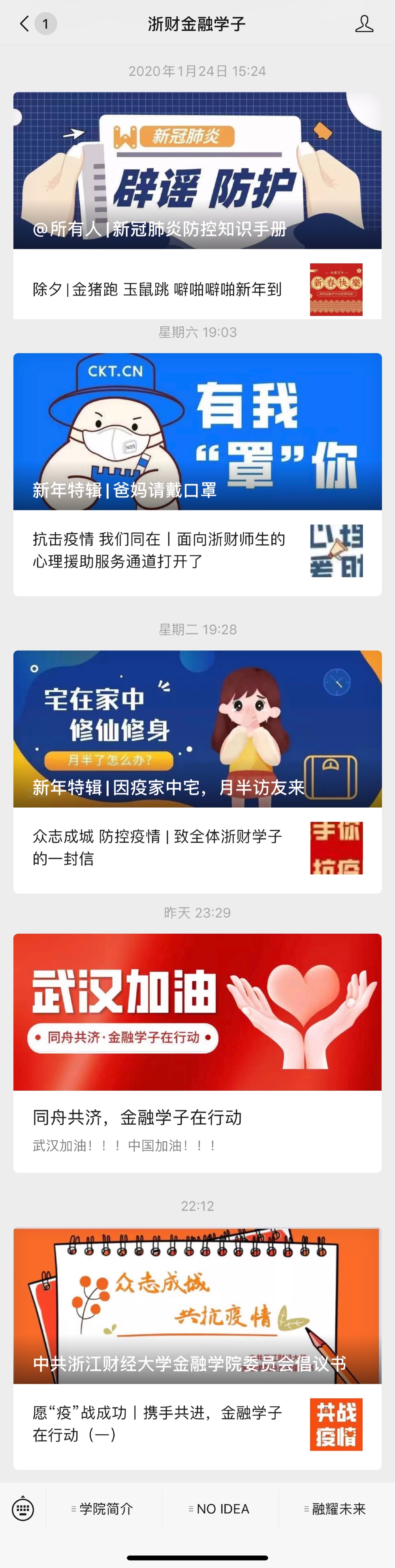 四、树立党员先锋,积极开展线上主题党日活动。博彩代理 党委积极传达并贯彻落实《中共博彩代理 委员会关于深入贯彻落实习近平总书记重要指示精神 在疫情防控中充分发挥基层党组织战斗堡垒和党员干部先锋模范作用的通知》文件精神,各支部充分利用微信群、“学习强国”学习平台,开展“众志成城,共抗疫情”线上主题党日活动。教工支部在“双带头人”教师党支部书记的带领下,认真做好教学、考试、科研等开学前准备工作,积极配合博彩代理 做好网络教学、实践课程调整等预案。研究生支部在金融研究生党支部公众号发起我是党员,我带头遵守规定微倡议,号召支部党员带头遵守各项防控措施,积极引导广大同学消除恐惧心理,坚定必胜信心。本科生支部正在通过“寻找抗疫微故事”、“抗疫随手拍”等活动,号召学生党员坚决服从大局、听从指挥、勇担使命,带头做好个人防疫,合理安排假期生活。