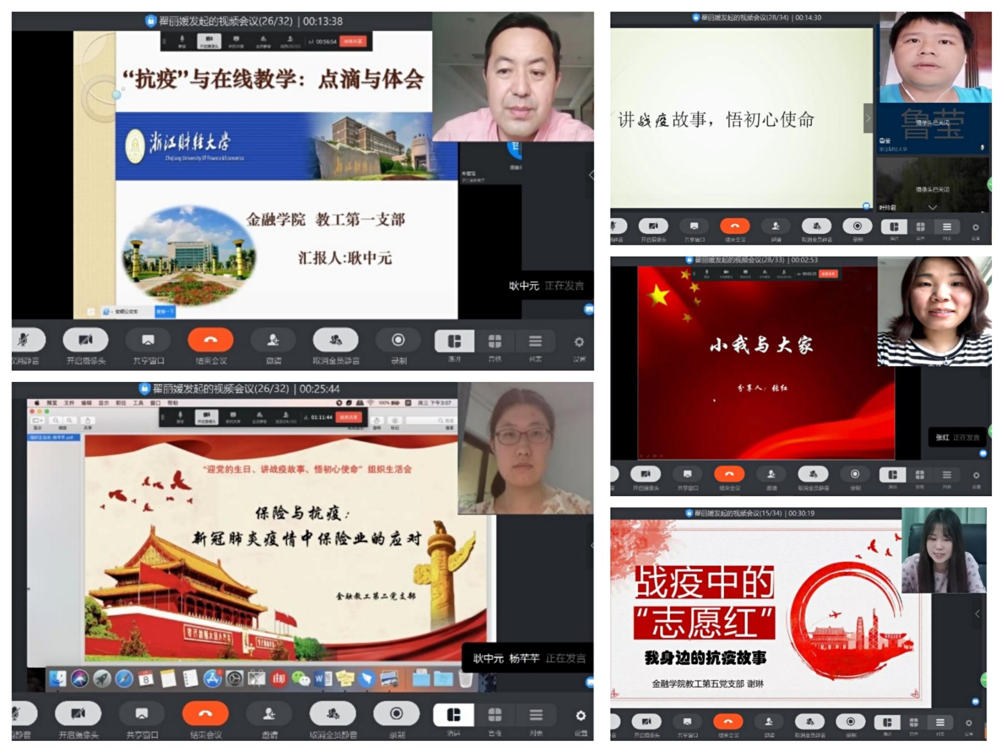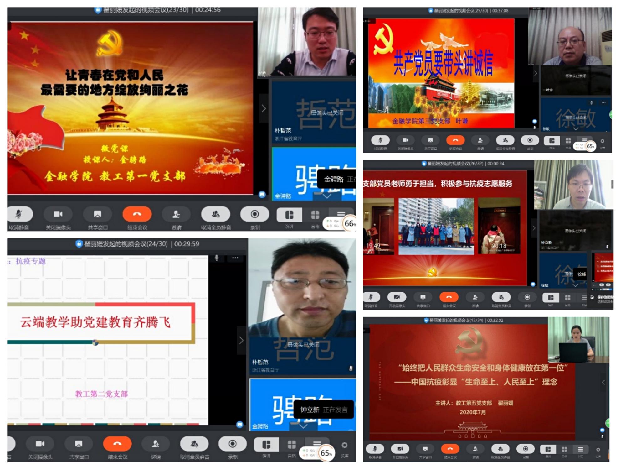 在“党旗飘扬 筑牢红色防火墙”——战“疫”专题微党课阶段,各教工党支部书记紧密围绕习近平总书记关于疫情防控重要讲话和指示批示精神,结合自身感悟体会,为全体党员讲述了一堂堂生动的微党课。教工第一党支部书记金骋路以“让青春在党和人民最需要的地方绽放绚丽之花”为题,结合习近平总书记给北京大学援鄂医疗队全体“90后”党员的回信、给复旦大学《共产党宣言》展示馆党员志愿服务队全体队员的回信,谈及自身将不忘初心、牢记使命,接过新时代的接力棒,继续砥砺前行。教工第二党支部书记钟立新以“云端教学助党建教育齐腾飞”为题,讲述了疫情特殊时期给云端党建、云端教学等带来了新的机遇,并提出在实际工作中要争创“党建+云端+教育”的特色品牌。教工第三党支部书记叶谦以“共产党员要讲诚信”为题,结合信用管理的专业特点,阐明了当代共产党员讲诚信的重要性,及如何以实际行动做诚信共产党员。教工第四党支部书记徐峰以“党员应该是天然志愿者”为题,讲述了支部党员教师在此次疫情防控中的志愿服务故事,强调共产党员要不断践行初心使命,充分发挥党员先锋模范作用。教工第五党支部书记翟丽媛以“中国抗疫彰显‘生命至上、人民至上’理念”为题,谈到中国始终把人民群众生命安全和身体健康放在第一位,以最大的努力、最严的措施、最快的速度,全面落实防控措施。