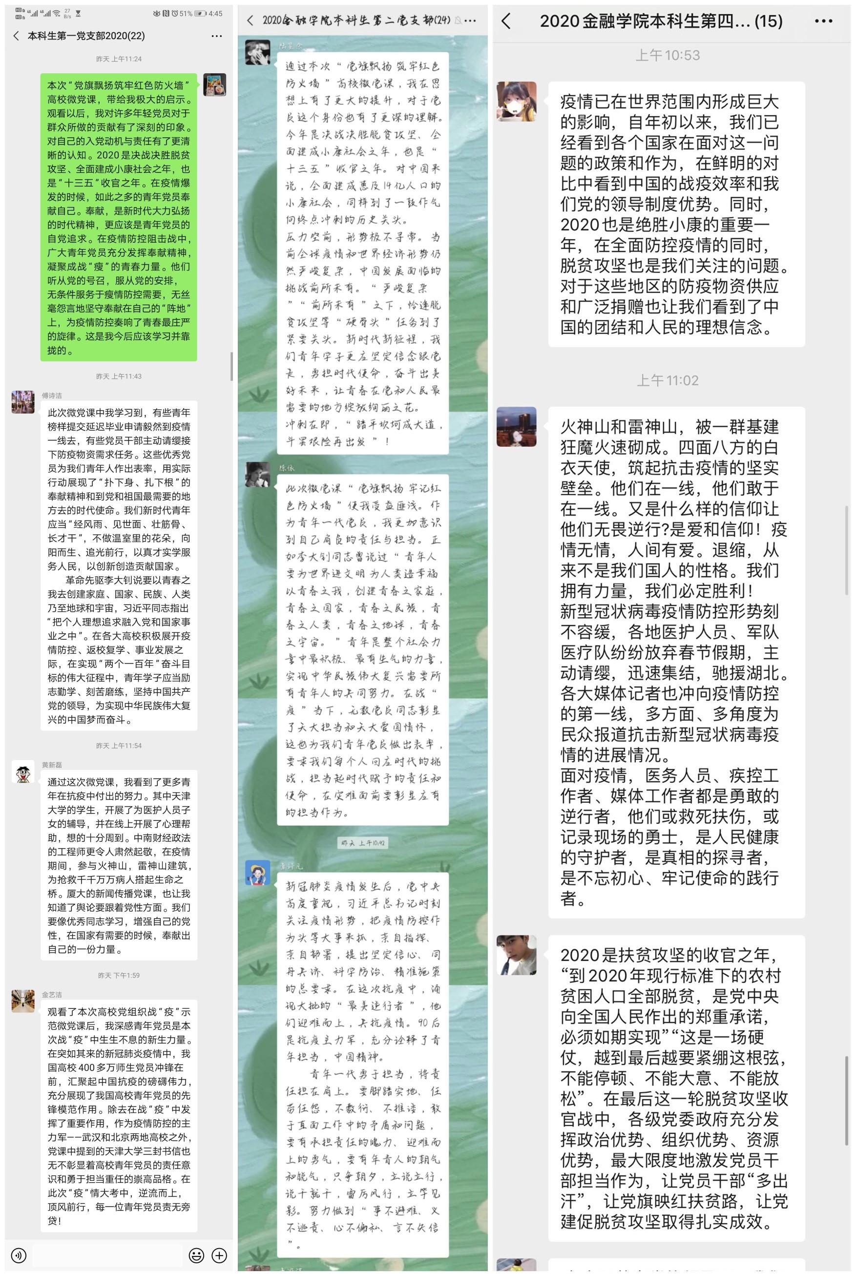 本科生第一党支部金艺洁“在突如其来的新冠肺炎疫情中,我国高校400多万师生党员冲锋在前,汇聚起中国抗疫的磅礴伟力,充分展现了我国高校青年党员的先锋模范作用。党课中提到的天津大学三封书信彰显着高校青年党员的责任意识和勇于担当重任的崇高品格在此次‘情大考中,逆流而上,顶风前行,每一位青年党员责无旁贷!”