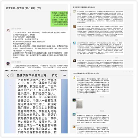 教工第一党支部鲁莹“高校师生党员们在这次战‘’疫过程中发挥才能,贡献热情,用各种方式交出了一份漂亮的答卷。不管是作为志愿者参与社区网格工作,还是用最新潮时髦的方式制作宣传防疫知识的短视频,或者通过‘屏对屏’方式助耕助农,高校师生党员们用自己的行动显示出了党员的先进性。为人民服务,尽己所能为国家做贡献,这种精神和觉悟值得所有党员努力学习,贯彻一生!”