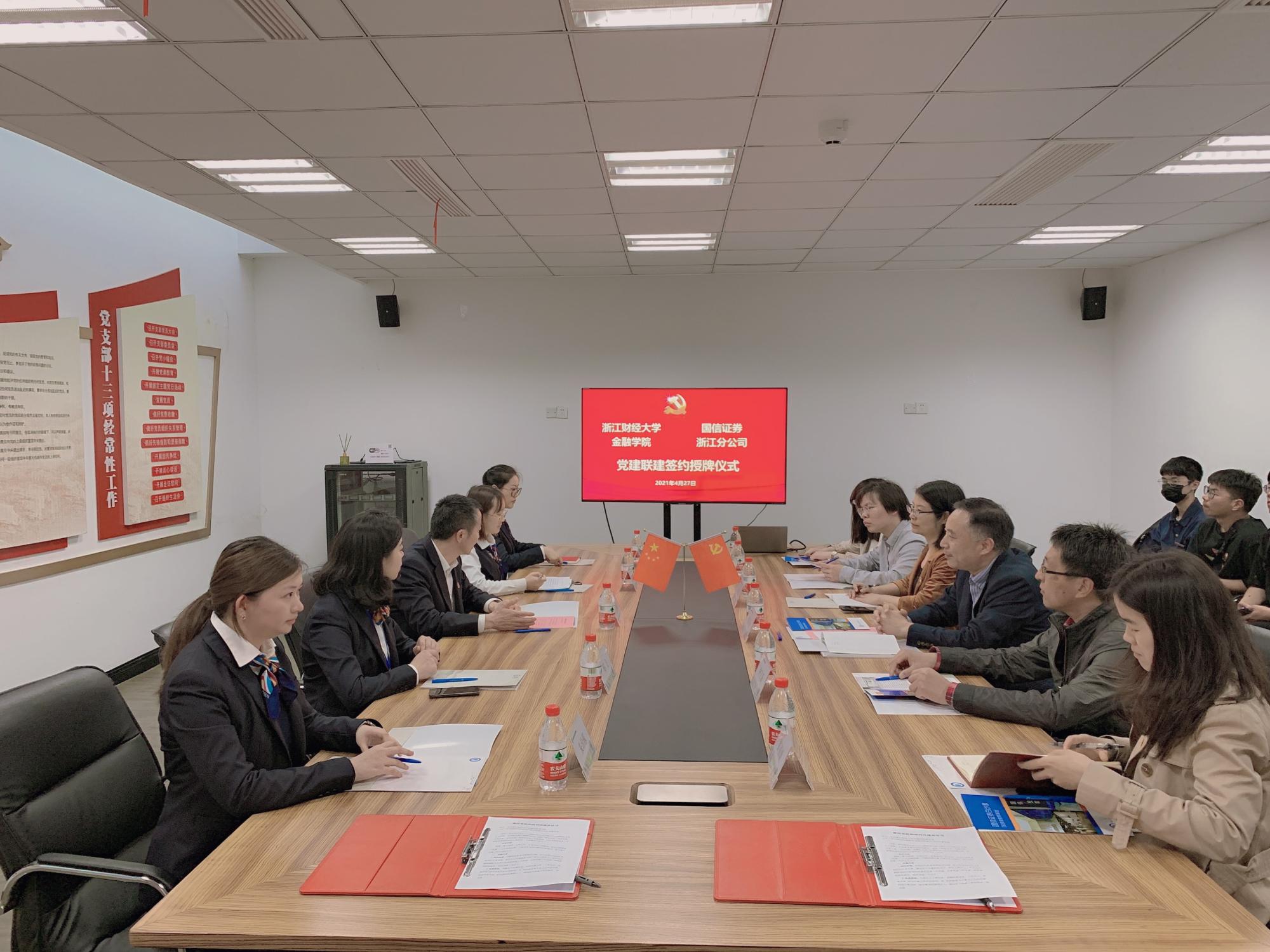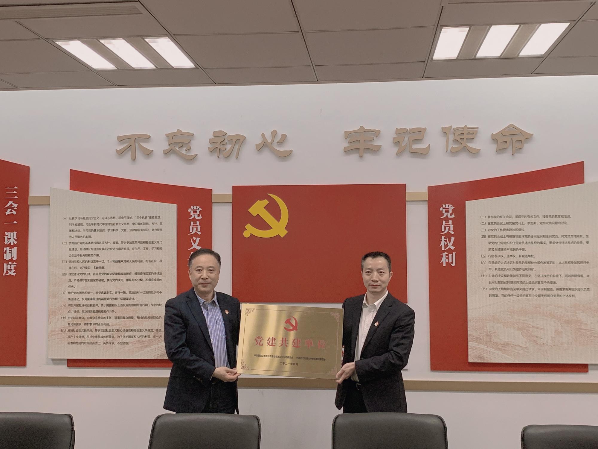 党委与国信证券浙江分公司党委在国信证券白沙泉投资者教育基地举行党建共建签约仪式。国信证券浙江分公司党委副书记王继翔,党委委员、第一党支部书记、党群办公室主任许清艳,第二党支部书记、直属业务二部总经理助理郑飞,博彩代理