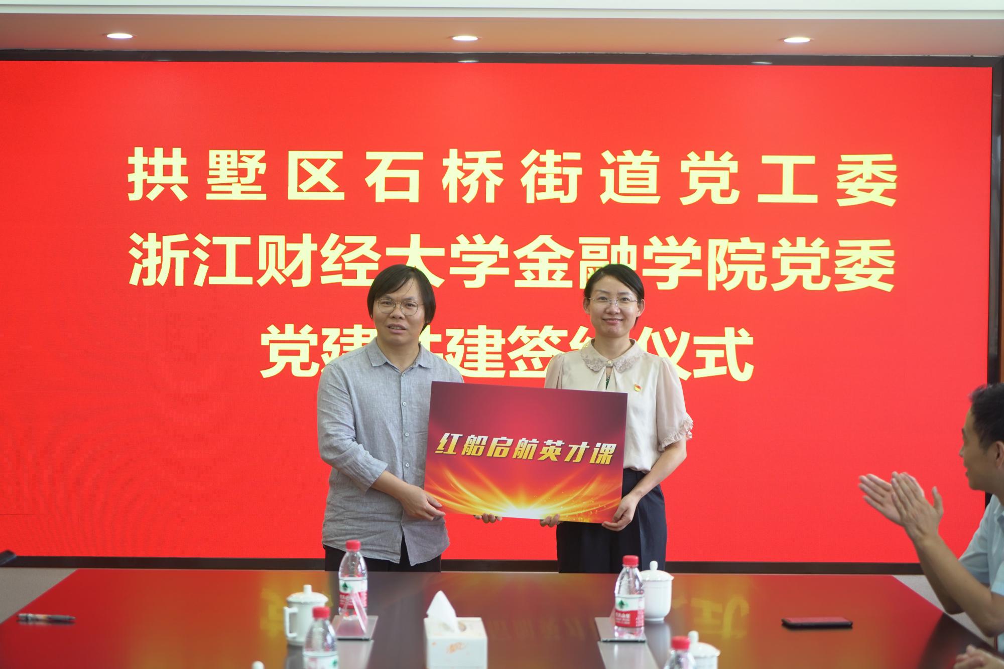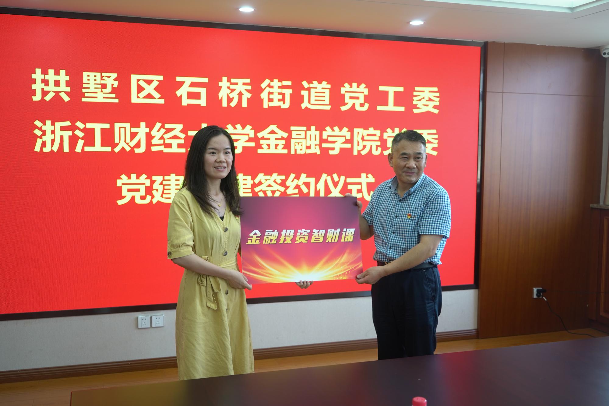 博彩代理 纪委委员、投资系主任徐峰向石桥街道党工委委员、组织委员张丹丹赠送“红船启航英才课”。