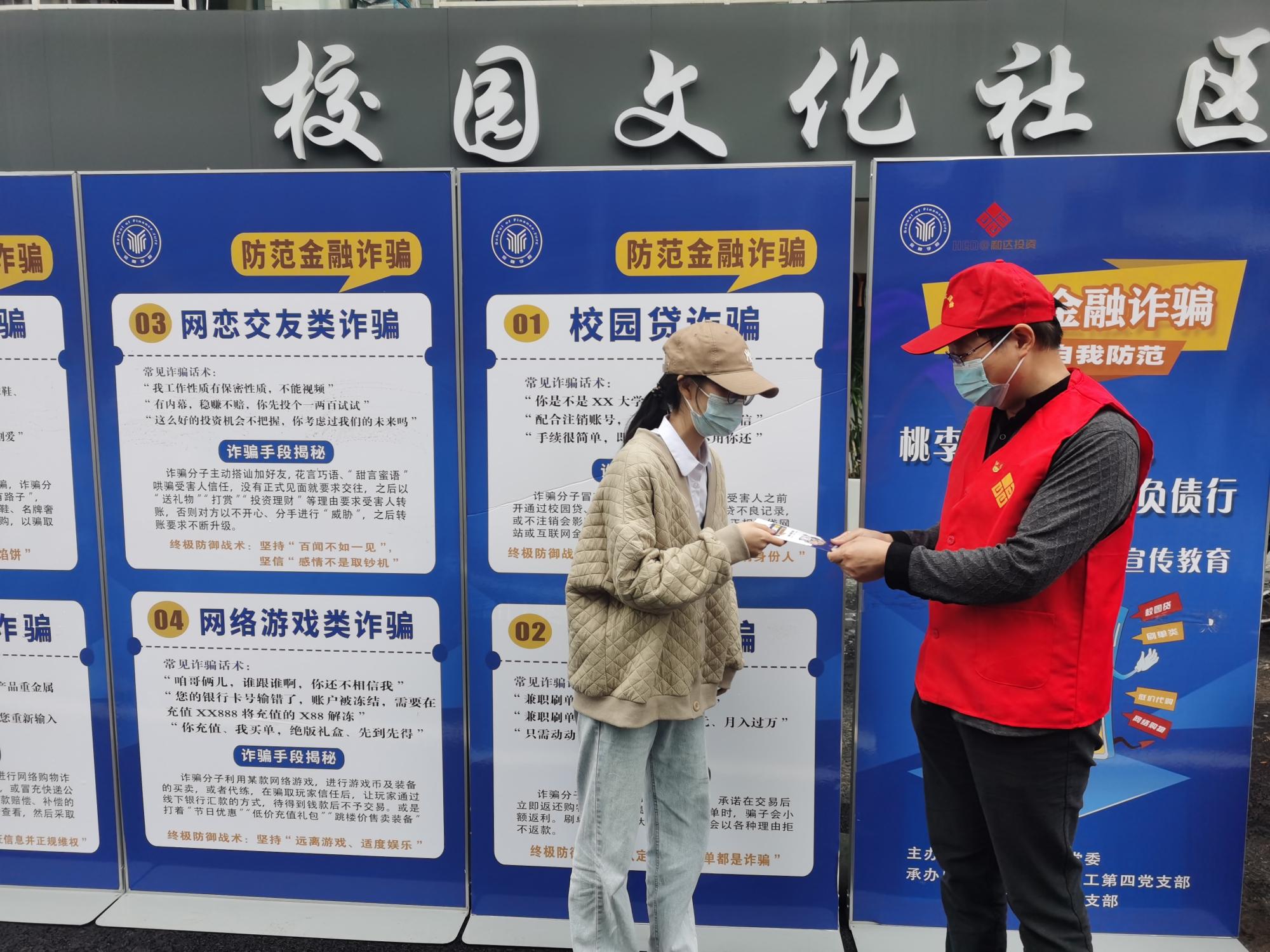 教工第四党支部与和达投资集团党支部在此前党建共建的基础上,联合举办了“桃李春风花开路,莫让青春负债行”——金融反诈骗宣传教育活动,为师生派发反诈宣传手册,耐心讲解金融诈骗类型,增强广大师生的识诈、防诈和反诈意识,引导树立理性消费观念,做理性投资者。