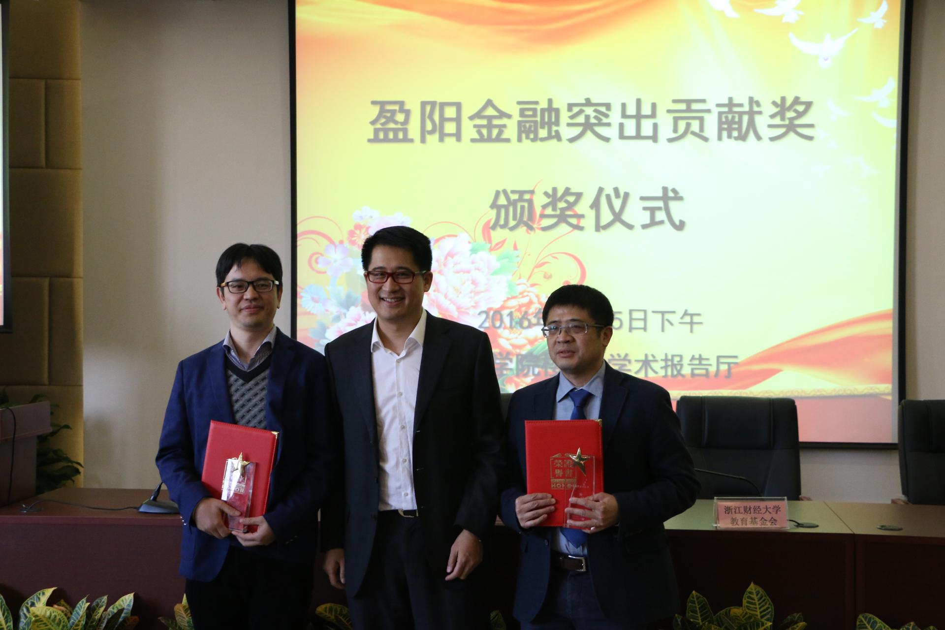 随后举行了盈阳金融突出贡献奖颁奖仪式,陈荣达教授与胡旭阳教授获得盈阳金融突出贡献奖金奖。浙江盈阳资产管理股份有限公司创始人楼栋先生为他们颁奖,并合影留念。最后,胡旭阳教授上台发言,他通过形象生动的语言,结合自己的亲身经历,介绍了博彩代理