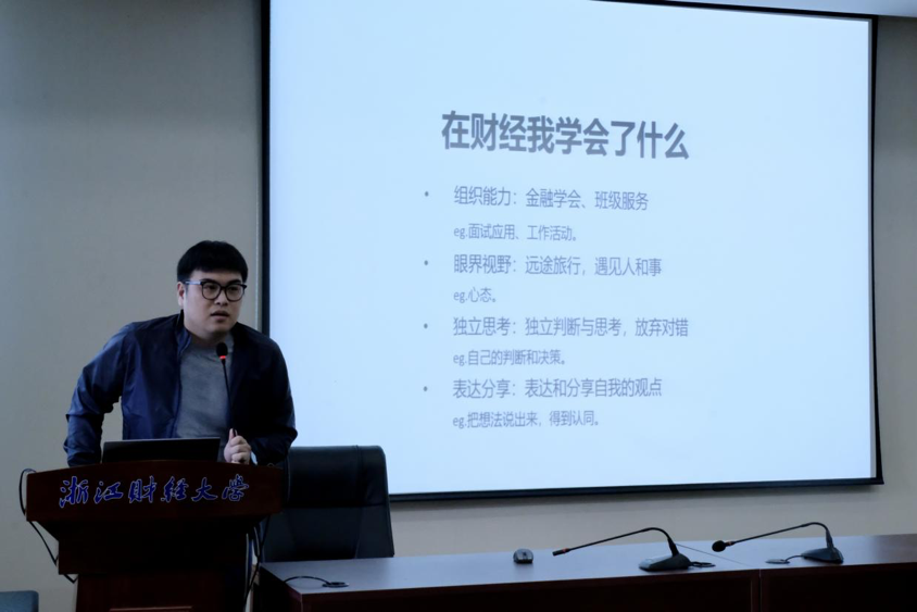 楼202报告厅顺利举行。本次沙龙邀请了万向信托股份公司副总裁、93届校友斯伟波,浙江尚科生物医药有限公司董事长、98届校友周朝晖,浙江银万斯特投资管理有限公司合伙人&投资总监、05届校友赵峰,以及蚂蚁集团网商银行高级产品专家、13届校友余谦等四位优秀校友,与同学们分享他们的个人经历以及关于更好开展金融专业学习的方法。校友们横跨数载时空,将校园与外面的世界巧妙对接,在热情洋溢的氛围当中实现了沟通感情、多角度育人的双重作用。