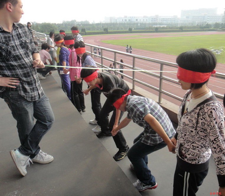 活动由四个部分组成:第一部分,分组制作代表成员特色的海报。各队名名如其人:张扬,自信;第二部分是接力任务——需要用队员贡献出的鞋带、鞋子、头发等等来完成接力跑步,讲求团队精神。第三部分是趣味接力,所有人员都用布条蒙住了眼睛,手拉手一起越过重重障碍。