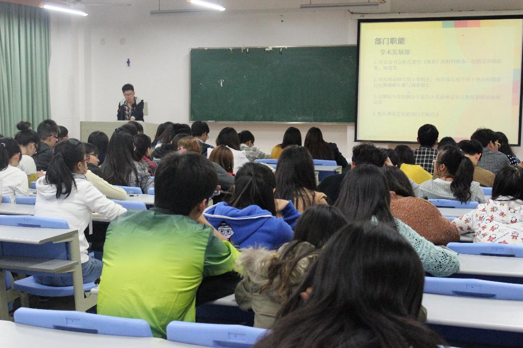 本次大会内容主要分为上一年度的工作总结、对各部门职能的介绍、下一年度的工作计划和部门考核制度五个部分。会议开始后,首先由会长张琛垚对邓读过去的工作做了简明扼要的总结,并介绍了邓读的组织构架和各部门的职能。接着,他向会员隆重推出邓读出版策划的杂志——《视界》,鼓励会员积极参与投稿。此后,邓读各部门部长简单介绍了各自未来的工作计划,其中包括《视界》的征文以及特色期刊制作、时事评论员大赛、志愿者服务队活动等等。最后,会长向会员们介绍了入党积极分子考核推优制度。邓读将秉着公正、真实、科学的原则,对会员的会议出勤情况、相关活动的表现以及志愿服务队的成果展现进行考核,以选拔出具备优秀品质的入党积极分子。通过具体的考核项目,合理的考核规定,促进全院入党积极分子整体素质的提高。