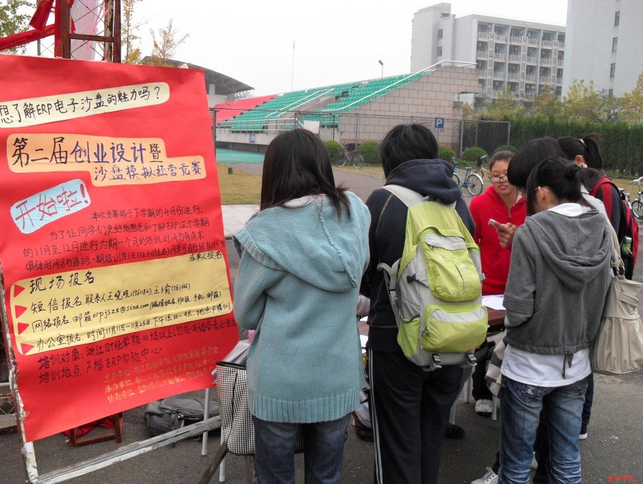 的同学们更全面、更深入地了解ERP的有关事项,公司金融学会的工作人员进行了半个多月的前期准备工作,设计ERP的海报,印发宣传单和报名表,及报名、培训时人员的安排工作。在现场报名期间,天气不如人意,这加大了报名工作的难度。但是,刺骨寒风、冰冷雨水阻挡不了工作人员为同学们介绍这次ERP培训相关事宜的热情。他们兢兢业业地在路上发着宣传单。一份份宣传单在同学们手中传阅,一张张报名表在同学们笔下趟过。