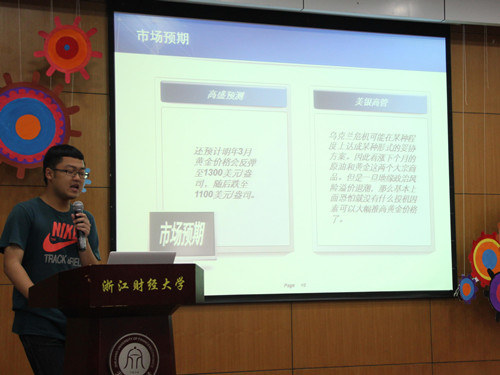 在现场观众的翘首期待中,模拟期货答辩决赛正式开始。本次大赛共有700余人参赛,最终共有7位浙财的民间金融高手凭借着在比赛中出色的收益率脱颖而出,他们分别是:朱超英、章炜、应烈阳、邵亨、吴帅、叶建德以及吴丹霞。在答辩中,选手们以自己的交易实况作为切入点,结合自己对市场的分析,阐明了自己各有千秋、极具说服力的投资理念,体现了财大学子优秀的分析应用能力。现场评委的提问一针见血,观众们听得聚精会神,掌声时不时地响起。