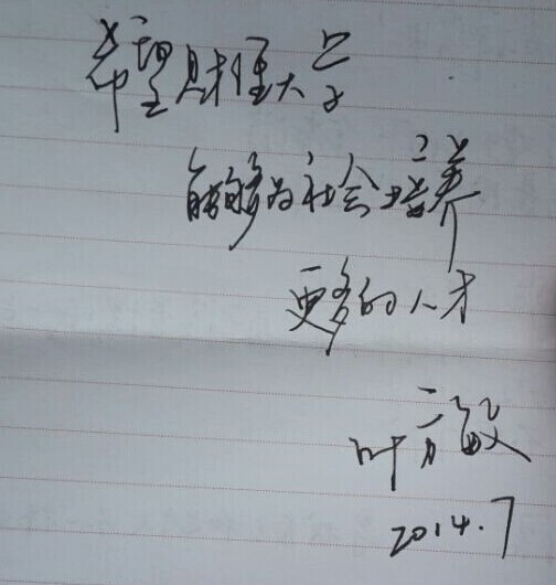 在谈笑声中,时间过得飞快,临别之际,我们送上了财大40周年校庆的邀请函,希望学长届时能莅临母校参加校庆。最后,叶学长与我们合影留念,并留下寄语:希望财经大学能够为社会培养更多的人才!