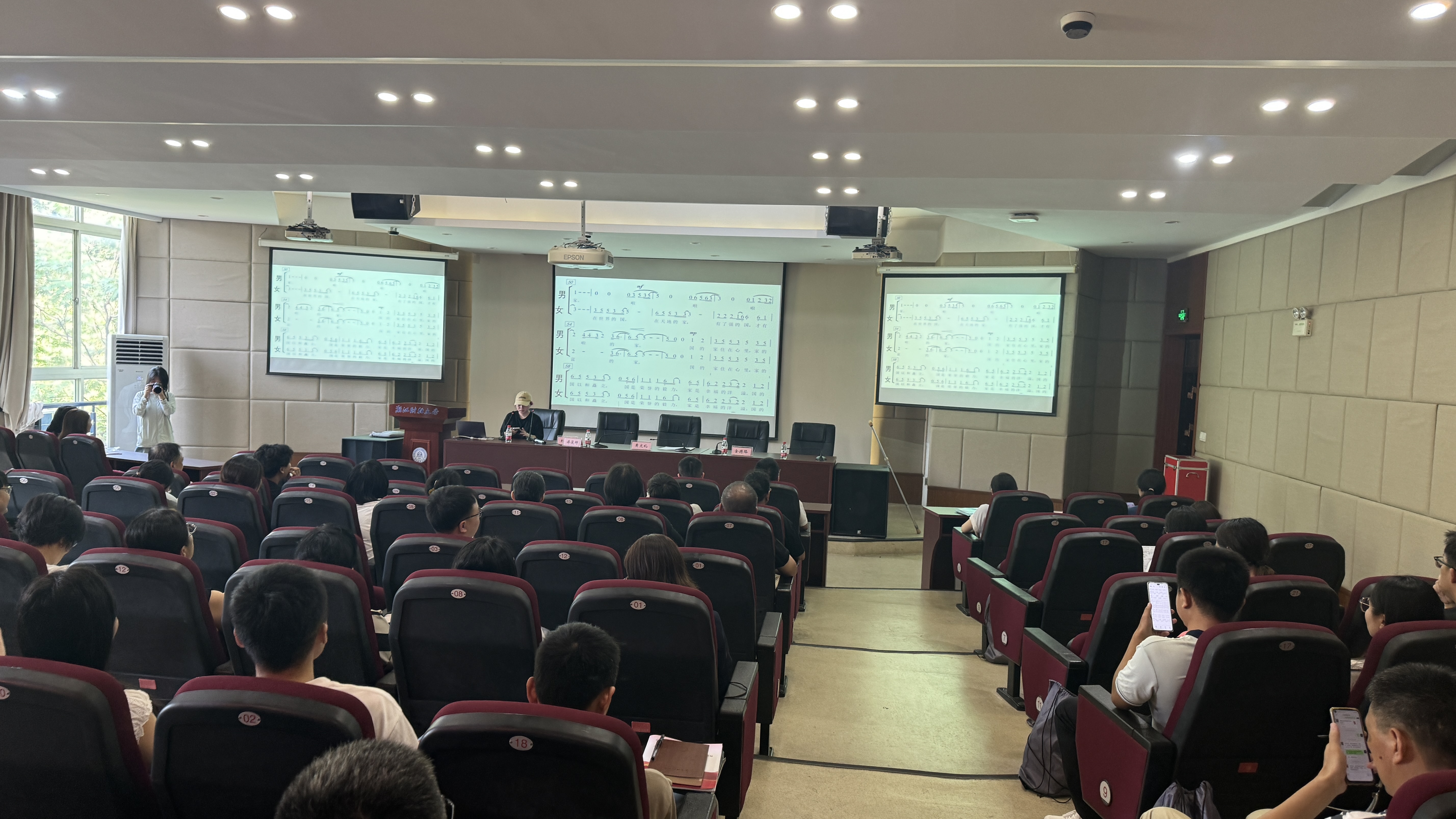老师们积极参与自此活动。在指挥的引导下,一句一句地学习,逐渐自信地大声地合唱出整首曲子,《国家》的旋律在大会议室中回荡。