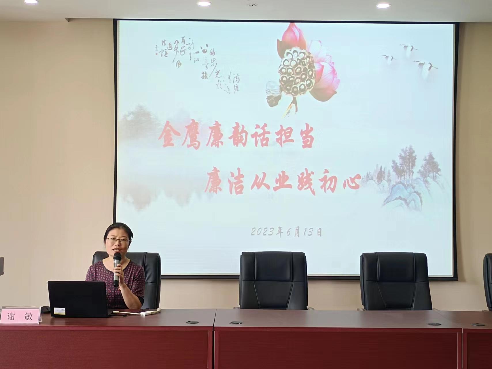 会议伊始,谢敏以《金鹰廉韵话担当廉洁从业践初心》为题,为全体毕业生党员讲授党课。她从《中国共产党章程(修正案)》中关于党的纪律的规定出发,向大家阐述了坚守纪律法律底线的重要性。她强调,廉洁奉公树立新风,廉洁是对每个行为主体的道德要求,是组织对每一位党员的政治要求;是社会对每一个公民的法律要求;是企业对每一位员工的发展要求。她呼吁全体毕业生党员要做到:明廉洁之意、守廉洁之义、走廉洁之路;经常审视“镜中自我”,筑牢思想道德防线,树廉洁之心、行廉洁之事、做廉洁之人。