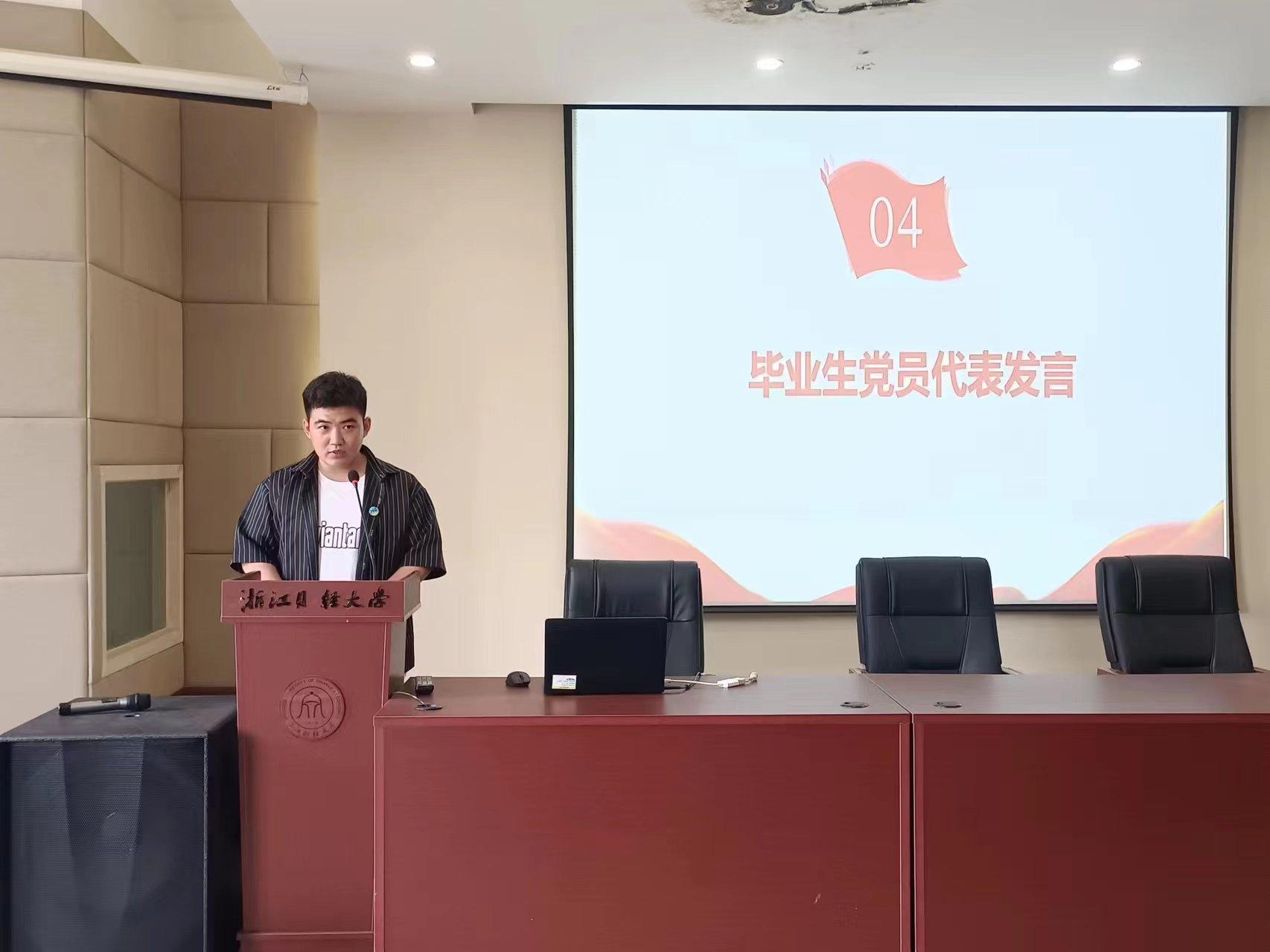 本科生第三党支部范家昕同学代表全体毕业生党员发言。他回忆了自己的成长经历,由衷感谢党组织、老师们和同志们的帮助和关心,并表示一定践行入党誓词,牢记忠诚使命、弘扬廉洁美德,通过实际行动谱写无愧于新时代的青春篇章。