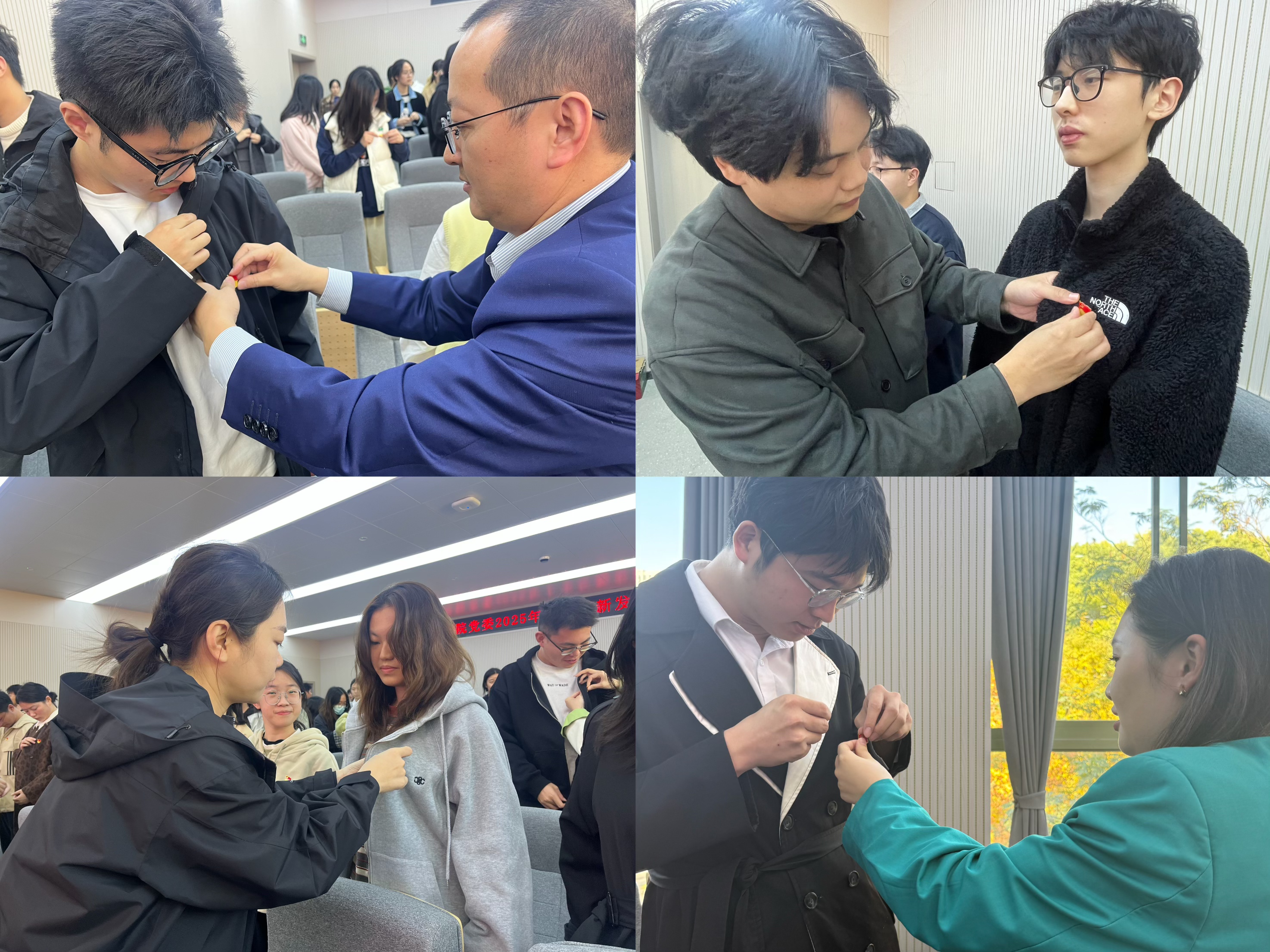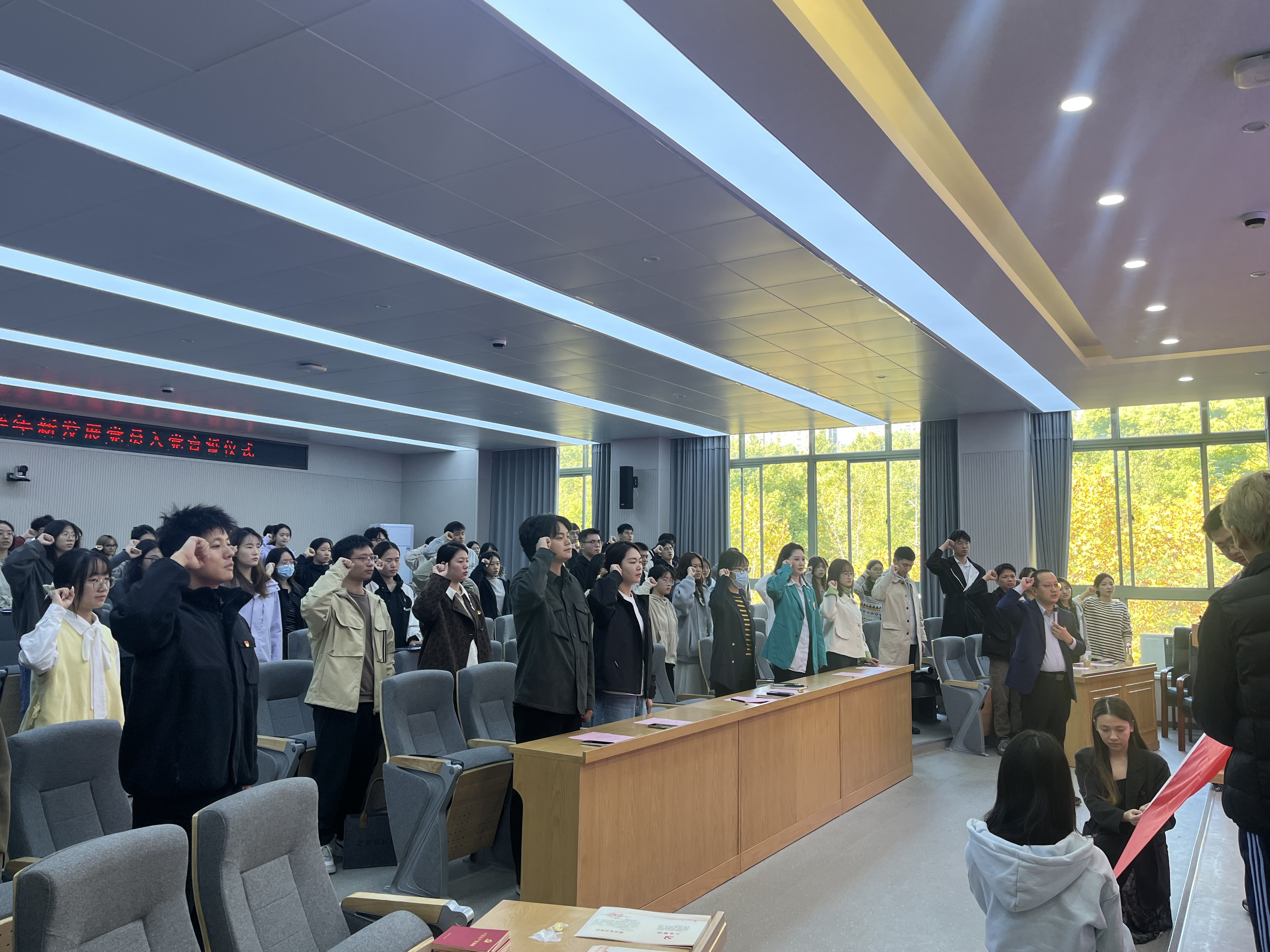 党委书记朱旭明、党委副书记陈思佳,各学生党支部书记、党建指导老师、老党员代表以及全体新发展党员参加了仪式。仪式由专职组织员翟丽媛主持。