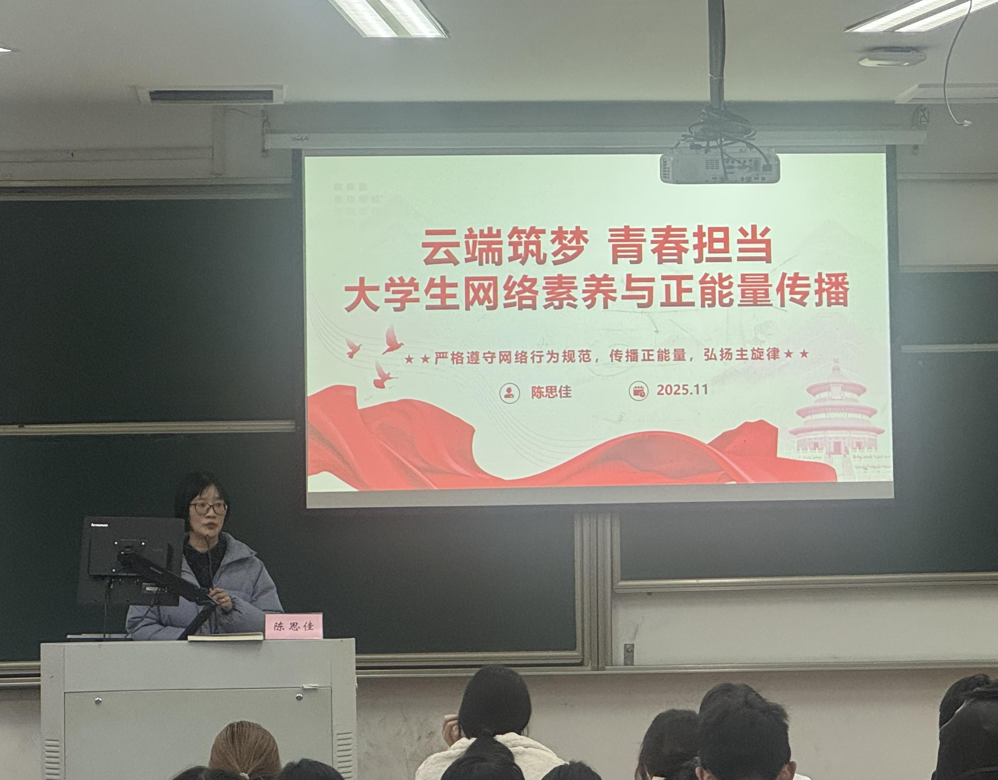 陈思佳以《云端筑梦青春担当——大学生网络素养与正能量传播》为题,从互联网助力追逐梦想切入,结合大量实际案例,深入阐述维护国家网络安全的重要性,详细分析当下网络环境中的潜在风险。她强调,入党积极分子作为青年先锋,应“学网懂网用网”,主动承担起宣传主流思想、传播正能量的责任。